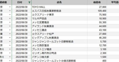 【関東】2022/6/30(木)出したお店まとめ関東の店舗都県 日付 店舗 総差枚 平均差枚 東京 2022/6/30 TOYO HALL 27,800 250 東京 2022/6/30 エスパス日拓秋葉原駅前店 109,400 230 東京 2022/6/... -