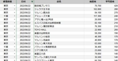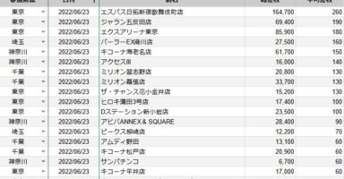 【関東】2022/6/23(木)出したお店まとめ関東の店舗都県 日付 店舗 総差枚 平均差枚 東京 2022/6/23 エスパス日拓新宿歌舞伎町店 164,700 260 東京 2022/6/23 ジャラン五反田店 69,400 190 東京 2022/6/... -