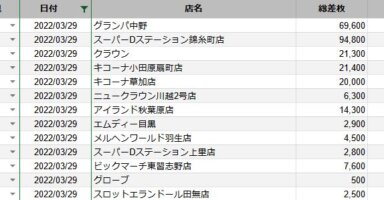 【関東】2022/3/29(火)出したお店まとめ関東の店舗都県 日付 店舗 総差枚 平均差枚 東京 2022/3/29 グランパ中野 69,600 350 東京 2022/3/29 スーパーDステーション錦糸町店 94,800 270 東京 2022/3/2... -