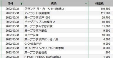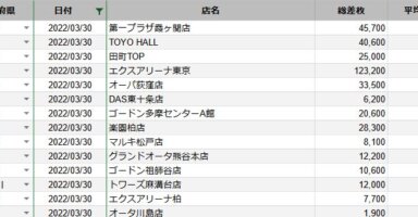 【関東】2022/3/31(木)出したお店まとめ関東の店舗都県 日付 店舗 総差枚 平均差枚 東京 2022/3/31 グランド ラ・カータ1111瑞穂店 119,300 310 東京 2022/3/31 アイランド秋葉原店 111,900 300 埼玉 2... -