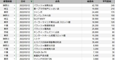 【関東】2022/3/12(土)出したお店まとめ関東の店舗都県 日付 店舗 総差枚 平均差枚 神奈川 2022/3/12 パラッツォ湘南台店 42,700 240 埼玉 2022/3/12 第一プラザ坂戸にっさい店 19,800 210 東京 2022/3/... -