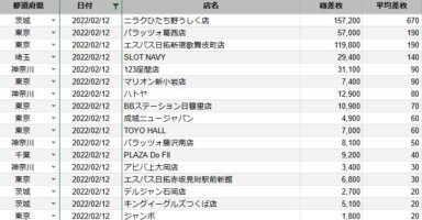 【関東】2022/2/12(土)出したお店まとめ関東の店舗都県 日付 店舗 総差枚 平均差枚 茨城 2022/2/12 ニラクひたち野うしく店 157,200 670 東京 2022/2/12 パラッツォ葛西店 57,000 190 東京 2022/2/12...