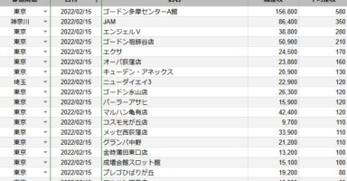 【関東】2022/2/15(火)出したお店まとめ関東の店舗都県 日付 店舗 総差枚 平均差枚 東京 2022/2/15 ゴードン多摩センターA館 156,800 580 神奈川 2022/2/15 JAM 86,400 350 東京 2022/2/15 エン... -