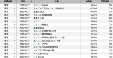 【関東】2022/1/27(木)出したお店まとめ関東の店舗都県 日付 店舗 総差枚 平均差枚 東京 2022/1/27 マルハン池袋店 96,600 380 東京 2022/1/27 スーパーDステーション錦糸町店 117,800 330 東京 2022/1... -