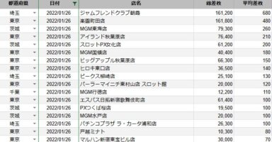 【関東】2022/1/24(月)出したお店まとめ関東の店舗都県 日付 店舗 総差枚 平均差枚 東京 2022/01/24 マルハン新宿東宝ビル店 172,300 350 東京 2022/01/24 マルハン池袋店 76,500 300 埼玉 2022/01/... -