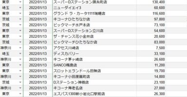 【関東】2022/1/13(木)出したお店まとめ関東の店舗都県 日付 店舗 総差枚 平均差枚 東京 2022/1/13 スーパーDステーション錦糸町店 130,400 370 埼玉 2022/1/13 ニューダイエイ3 60,600 320 東京 2022/... -