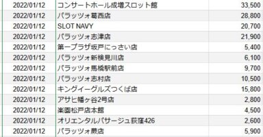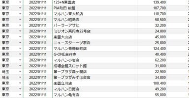 【関東】2022/1/11(火)出したお店まとめ関東の店舗都県 日付 店舗 総差枚 平均差枚 東京 2022/1/11 123+N東雲店 139,400 340 東京 2022/1/11 PIA町田 新館 107,700 330 東京 2022/1/11 マ... -