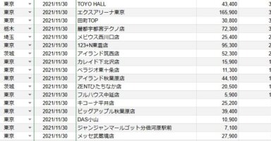 【関東】2021/11/30(火)出したお店まとめ関東の店舗都県 日付 店舗 総差枚 平均差枚 東京 2021/11/30 TOYO HALL 43,400 380 東京 2021/11/30 エクスアリーナ東京 165,900 350 東京 2021/11/... -