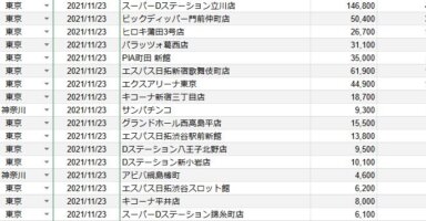 【関東】2021/11/22(月)出したお店まとめ関東の店舗都県 日付 店舗 総差枚 平均差枚 千葉 2021/11/22 マルハン習志野店 143,500 460 東京 2021/11/22 パラッツォ葛西店 105,900 350 東京 20... -