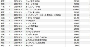 【関東】2021/11/21(日)出したお店まとめ関東の店舗都県 日付 店舗 総差枚 平均差枚 東京 11月21日 キングNo.1世田谷店 54,200 260 東京 11月21日 マルハン新宿東宝ビル店 109,900 220 神奈川 11月21日 サンパレ... -