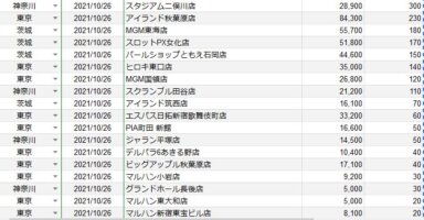 【関東】2021/10/25(月)出したお店まとめ関東の店舗都県 日付 店舗 総差枚 平均差枚 東京 10月25日 MGM国領店 88,900 380 東京 10月25日 コスモ光が丘店 25,700 290 埼玉 10月25日 SAP蒲生店 44,800 2...