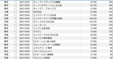 【関東】2021/10/9(土)出したお店まとめ関東の店舗都県 日付 店舗 総差枚 平均差枚 東京 2021/10/9 キューデンアネックス日暮里 36,700 390 東京 2021/10/9 スーパーDステーション立川店 114,700 380 東京 2... -
