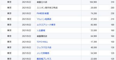 【関東】2021/9/22(水)出したお店まとめ関東の店舗都県 日付 店舗 総差枚 平均差枚 東京 2021/9/22 楽園立川店 184,900 310 東京 2021/9/22 ミリオン高円寺22号店 28,600 260 東京 2021/9/22 PI... -