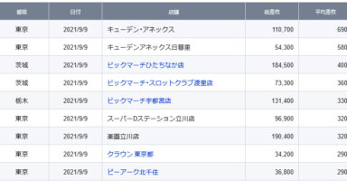 【関東】2021/9/9(木)出したお店まとめ関東の店舗都県 日付 店舗 総差枚 平均差枚 東京 2021/9/9 キューデン・アネックス 110,700 690 東京 2021/9/9 キューデンアネックス日暮里 54,300 580 茨城 2021/9... -
