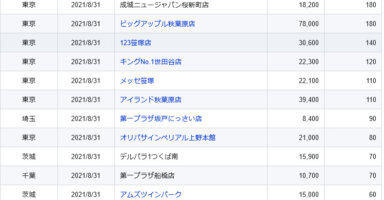 【関東】2021/8/31(火)出したお店まとめ関東の店舗都県 日付 店舗 総差枚 平均差枚 埼玉 2021/8/31 第一プラザみずほ台店 38,700 210 東京 2021/8/31 成城ニュージャパン桜新町店 18,200 180 東京 2021/8... -