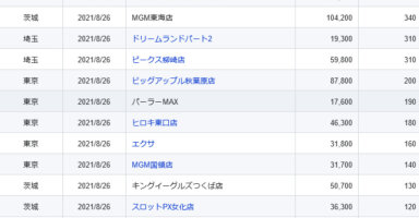 【関東】2021/8/26(木)出したお店まとめ関東の店舗都県 日付 店舗 総差枚 平均差枚 埼玉 2021/8/26 ジャムフレンドクラブ朝霞 176,300 750 茨城 2021/8/26 MGM東海店 104,200 340 埼玉 2021/8/26... -