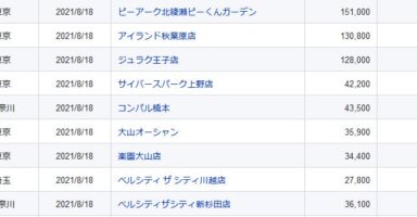 【関東】2021/8/18(水)出したお店まとめ関東の店舗都県 日付 店舗 総差枚 平均差枚 東京 2021/8/18 ピーアーク北綾瀬ピーくんガーデン 151,000 420 東京 2021/8/18 アイランド秋葉原店 130,800 350 東京 20...