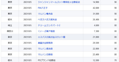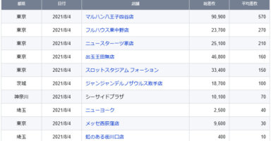 【関東】2021/8/4(水)出したお店まとめ関東の店舗都県 日付 店舗 総差枚 平均差枚 東京 2021/8/4 マルハン八王子四谷店 90,900 570 東京 2021/8/4 フルハウス東中野店 23,700 270 東京 2021/8/4 ニュー...