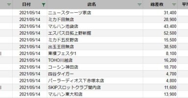 【関東】2021/5/14(金)出したお店まとめ関東の店舗都県 日付 店舗 総差枚 平均差枚 東京 2021/5/14 ニュースター一ツ家店 31,400 270 東京 2021/5/14 ミカド田無店 28,900 240 東京 2021/5/14 マルハ... -