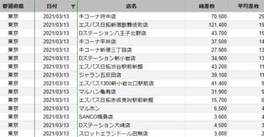 【関東】2021/3/13(土)出したお店まとめ関東の店舗都県 日付 店舗 総差枚 平均差枚 東京 2021/3/13 キコーナ府中店 70,500 290 東京 2021/3/13 エスパス日拓新宿歌舞伎町店 121,400 190 東京 2021/3/1... -
