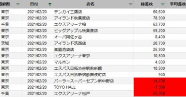 【関東】2021/2/20(土)出したお店まとめ関東の店舗都県 日付 店舗 総差枚 平均差枚 東京 2021/2/20 テンガイ三鷹店 60,600 260 東京 2021/2/20 アイランド秋葉原店 78,900 210 千葉 2021/2/20 エクス... -
