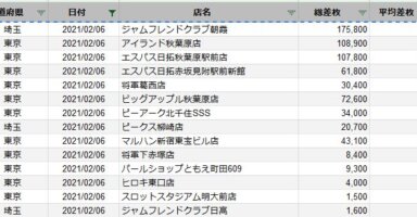 【関東】2021/2/6(土)出したお店まとめ関東の店舗都県 日付 店舗 総差枚 平均差枚 埼玉 2021/2/6 ジャムフレンドクラブ朝霞 175,800 730 東京 2021/2/6 アイランド秋葉原店 108,900 290 東京 2021/2/6... -