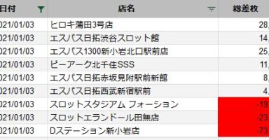 【関東】2021/1/3(日)出したお店まとめ関東の店舗都県 日付 店舗 総差枚 平均差枚 東京 2021/1/3 ヒロキ蒲田3号店 28,600 150 東京 2021/1/3 エスパス日拓渋谷スロット館 14,900 60 東京 2021/1/3 エス... -