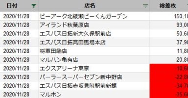 【関東】2020/11/28(土)出したお店まとめ関東の店舗都県 日付 店舗 総差枚 平均差枚 東京 2020/11/28 ピーアーク北綾瀬ピーくんガーデン 150,100 400 東京 2020/11/28 アイランド秋葉原店 93,000 250 東京 2... -