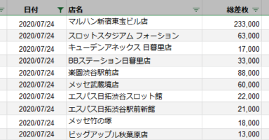 【関東】2020/7/24(金)出したお店関東の店舗都道府県 日付 店舗 総差枚 平均差枚 東京 2020/7/24 マルハン新宿東宝ビル店 233,000 530 東京 2020/7/24 スロットスタジアム フォーション 63,000 320 東... -