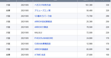 【関西】前日差枚ランキング 2021/9/8(水)関西の店舗府県 日付 店舗 総差枚 平均 大阪 2021/9/8 ベガス1700枚方店 161,300 330 兵庫 2021/9/8 アミューズ三ノ宮 50,400 320 大阪 2021/9/8 123春木... -