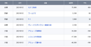 【関西】前日差枚ランキング 2021/8/12(木)関西の店舗府県 日付 店舗 総差枚 平均 兵庫 2021/8/12 モナコ別府 75,900 450 京都 2021/8/12 ワールド2 5,100 60 京都 2021/8/12 F-1 3,900 30 ... -