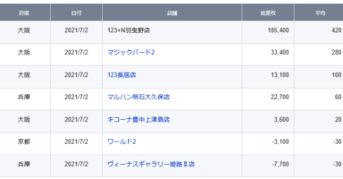 【関西】前日差枚ランキング 2021/7/2(金)関西の店舗府県 日付 店舗 総差枚 平均 大阪 2021/7/2 123+N羽曳野店 185,400 420 大阪 2021/7/2 マジックバード2 33,400 280 大阪 2021/7/2 123長居店... -