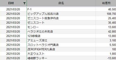 【関西】前日差枚ランキング 2021/3/20関西の店舗府県 日付 店舗 総差枚 平均 京都 2021/3/20 F-1 40,500 320 兵庫 2021/3/20 ビッグアップル加古川店 108,700 270 兵庫 2021/3/20 ゼニスコート... -